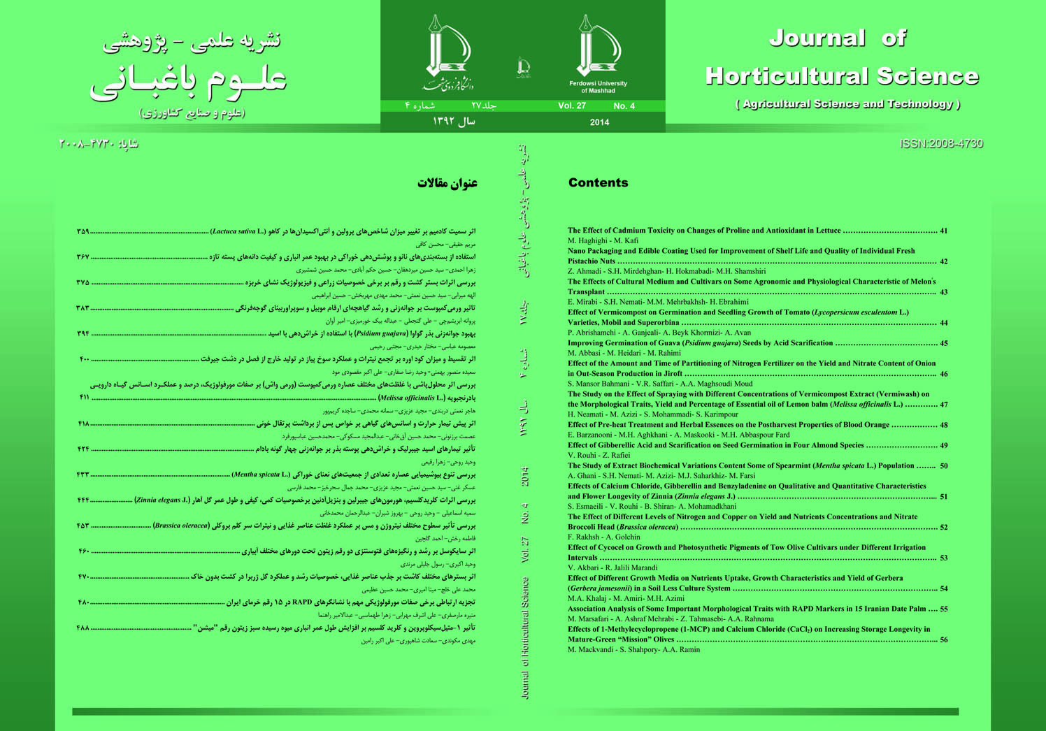 Information of heavy metal toxicity about physiological aspect of lettuce is limited. Therefore an experiment was conducted in CRD designed with 7 replications on lettuce (Lactuca sativa L.). Treatments were cadmium in 3 concentration (0, 2 and 4 mg/L) added to Hoagland solution. Results were shown that increasing in cadmium of nutrient solution caused increasing in SOD, POD antioxidant and proline contents of leaf tissues, in addition, cadmium decreased the amount of fresh weight and organic acid. Applying 2 and 4 mg/L cadmium in nutrient solution produced POD, SOD and Proline around 8 and 53%, 55 and 106%, 39 and 119% in 2 and 4 mg/L cadmium, respectively. Whereas in the same concentrations of cadmium protein decreased 25 and 5 %, respectively. Under cadmium stress, toxic effects decline photosynthesis more than chlorophyll content.